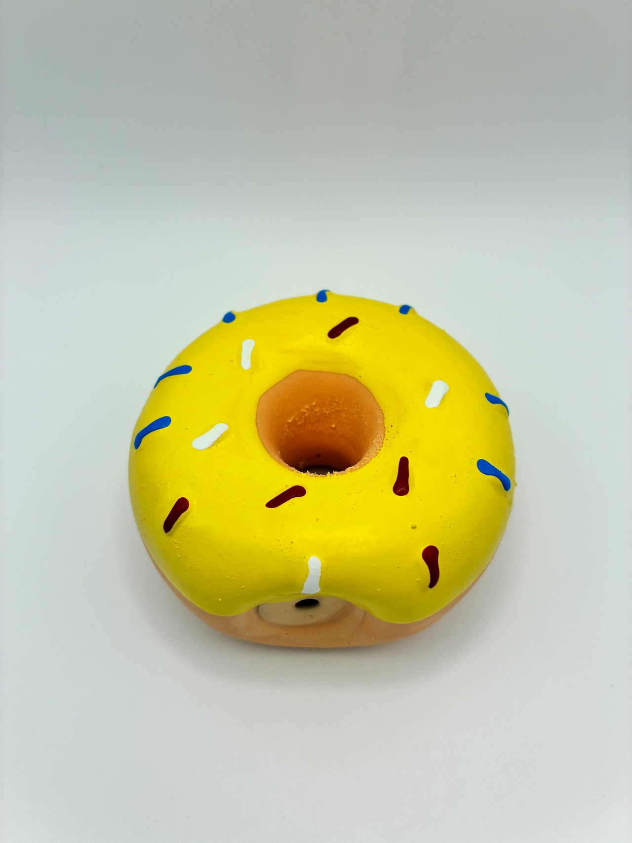ドーナツ型のゴムおもちゃです。ソフトタイプのラテックス製なので柔らかく、噛みつきやすいです。空気の出入でプーピー音が鳴ります。