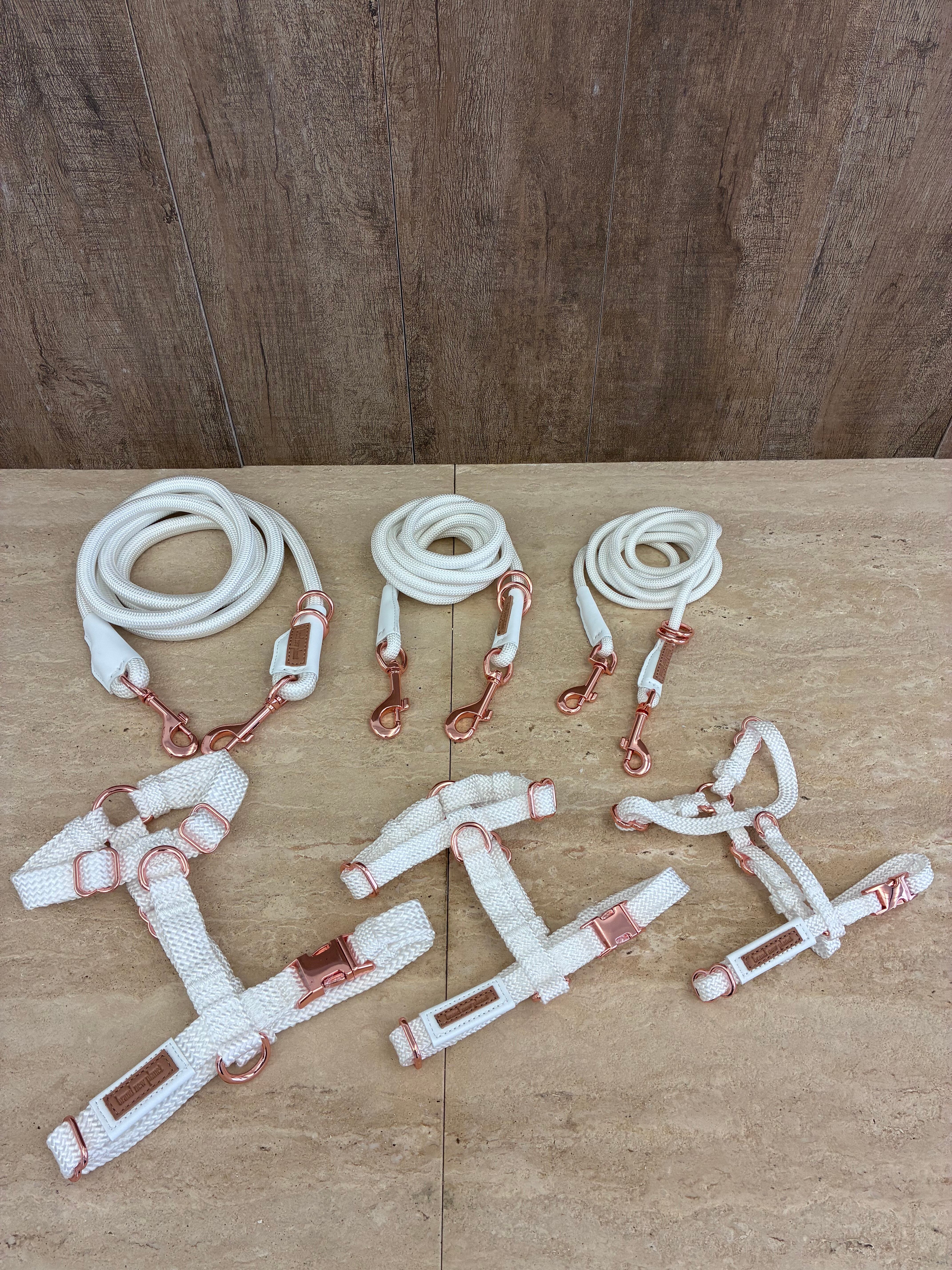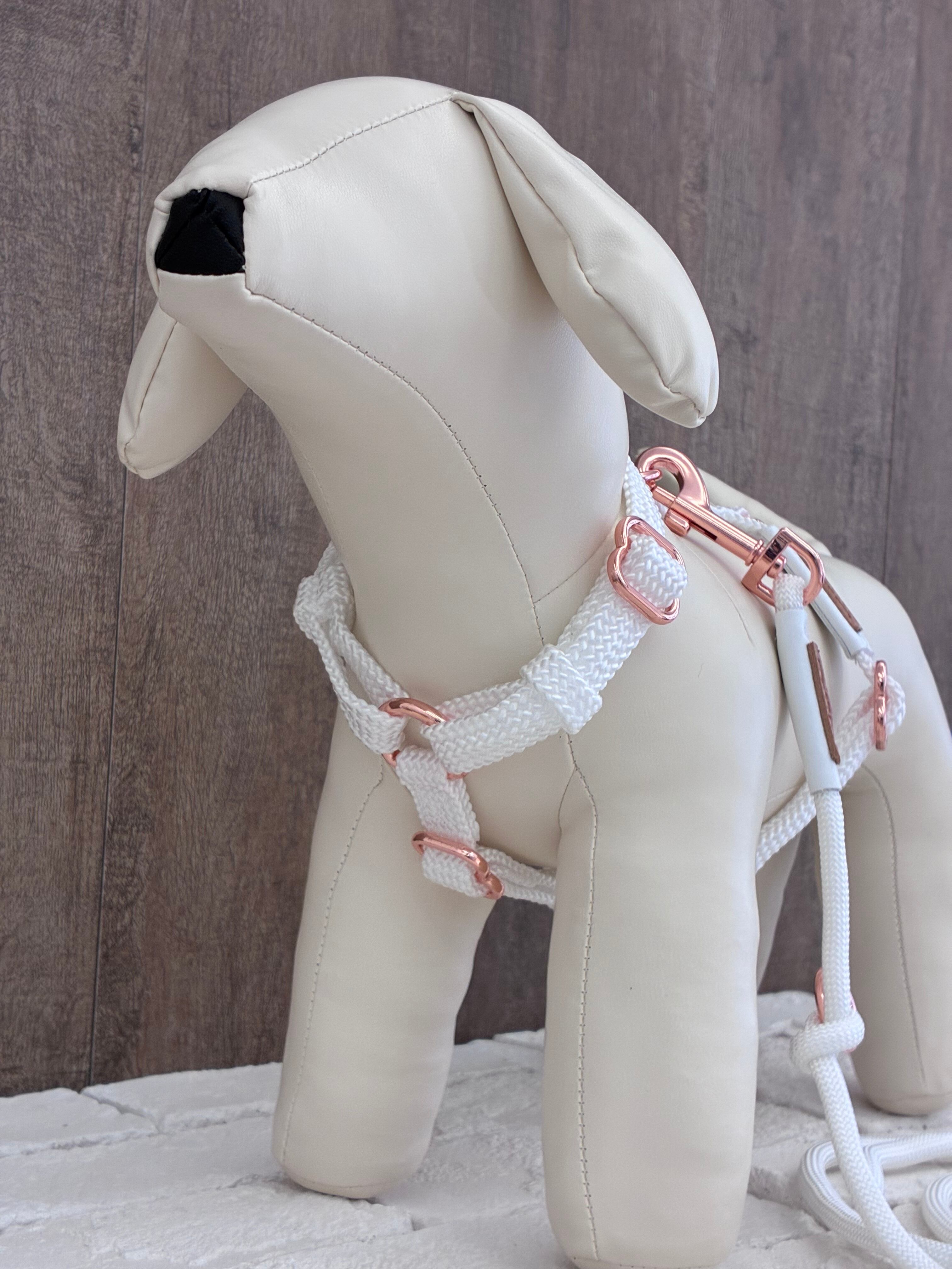 サイズXSのNEW ロープハーネスは、超小型犬に最適な一品です♪ ホワイトはピンクゴールドの金具で、ブラックはマットブラックの金具、めちゃくちゃおしゃれで愛犬を引き立てます!お散歩の時間がより楽しくなること間違いなしです!