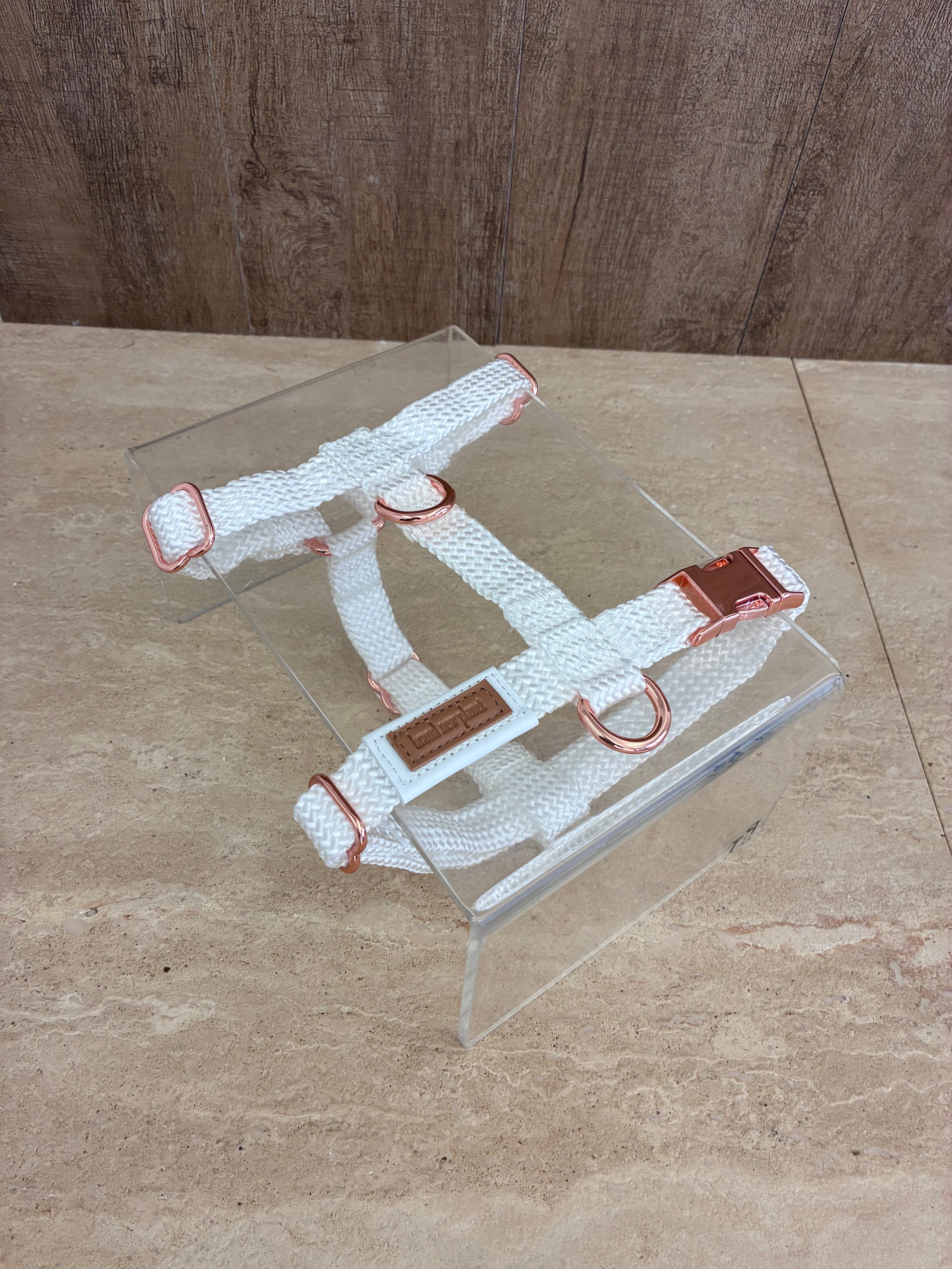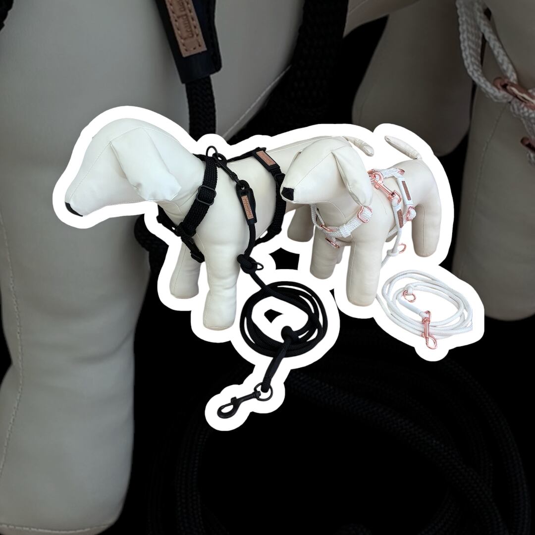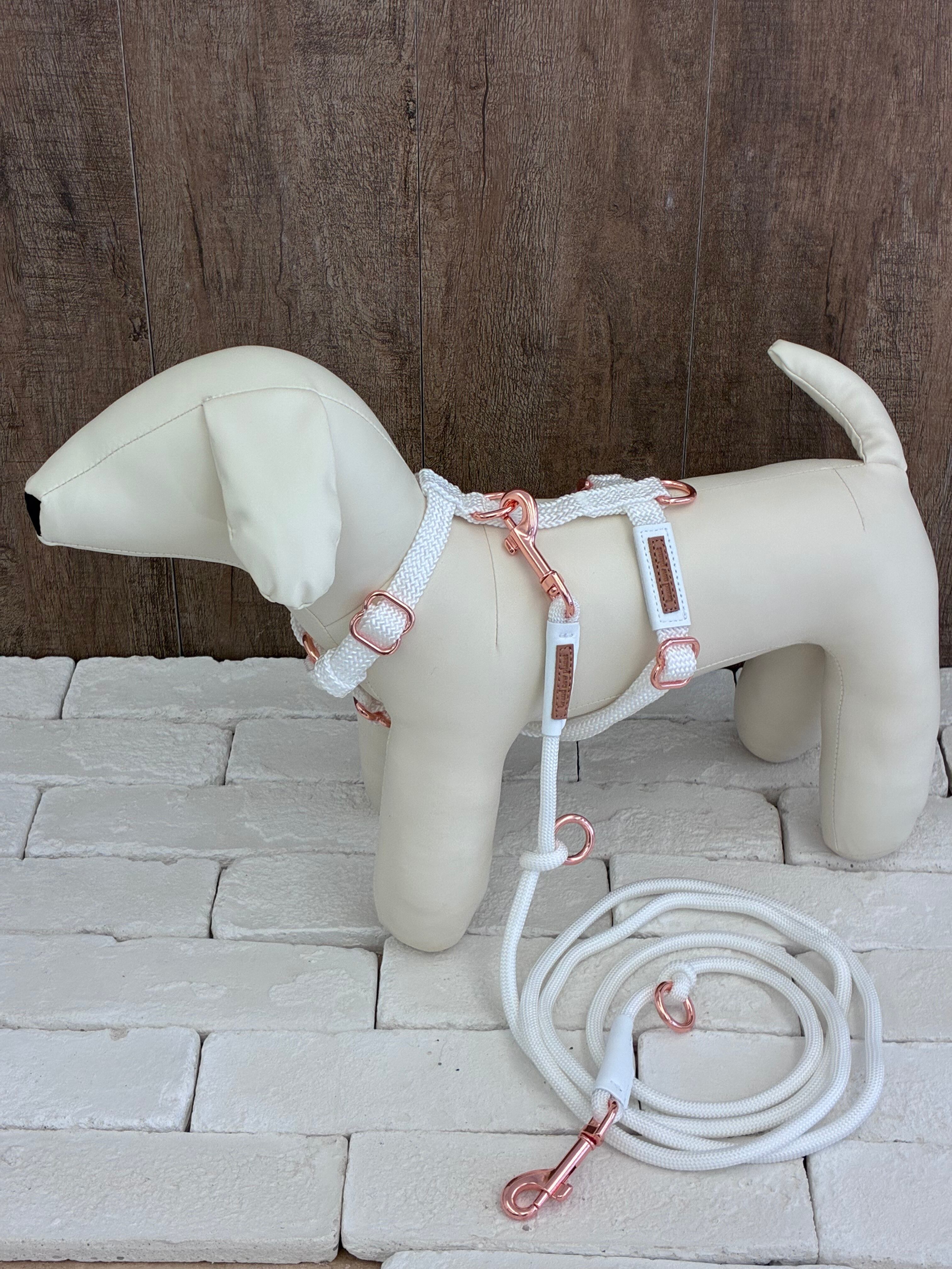 サイズMのNEW ロープハーネスは、中型犬に最適な一品です♪ ホワイトはピンクゴールドの金具、ブラックはマットブラックの金具、めちゃくちゃおしゃれで愛犬を引き立てます!お散歩の時間がより楽しくなること間違いなしです!